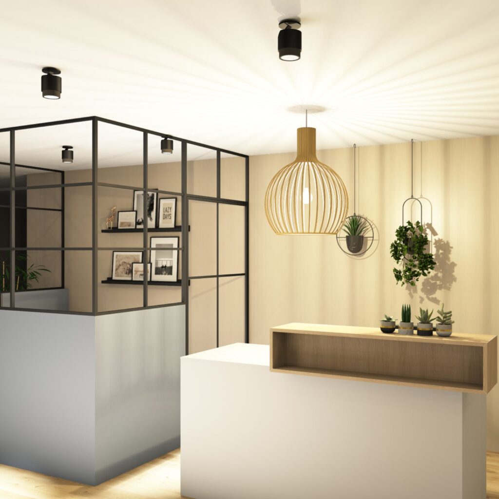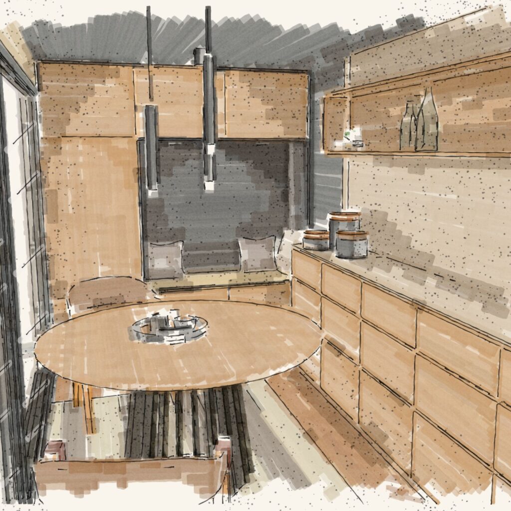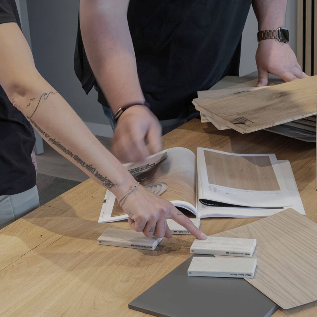 Zunächst erarbeiten wir ein Designkonzept für dich. Dazu nutzen wir 3D-Visualisierungen und Moodboards. So erstellen wir ein Konzept, das deine Bedürfnisse erfüllt. Dabei planen wir jedes Detail, um den Raum harmonisch zu gestalten – von den Farbtönen über die Möblierung und passende Beleuchtung bis zur Materialauswahl.